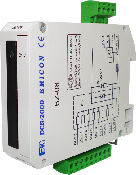 Блок предназначен для питания напряжением 24 В находящихся во взрывоопасной зоне датчиков дискретных сигналов при их подключении к модулю ввода дискретных сигналов DI-07-Ex.